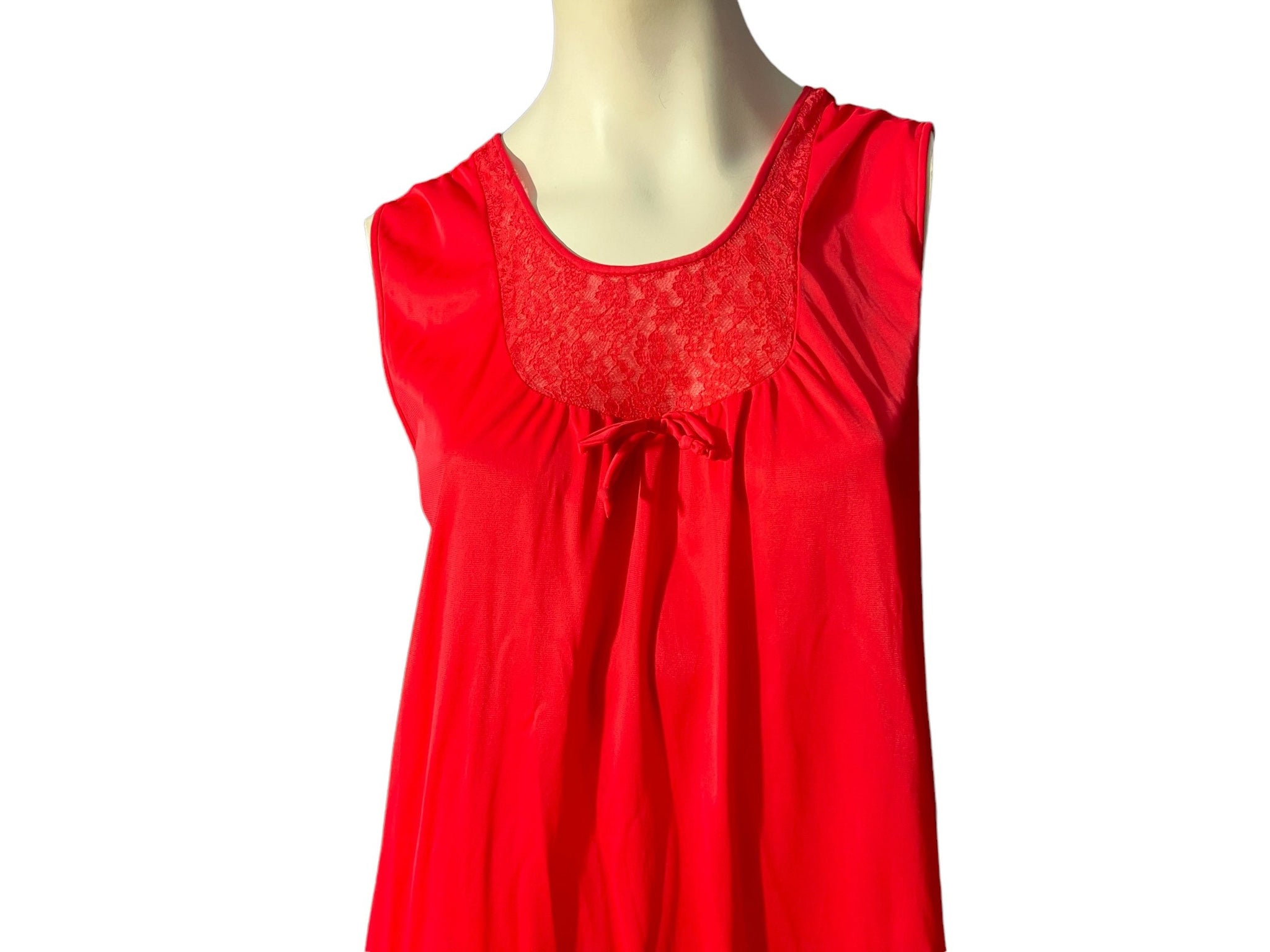 Vintage long red nightgown, tag says sz M, all nylon. Nightgown has lace detailing at the top with a bow. Nightgown is in great condition, measurements are