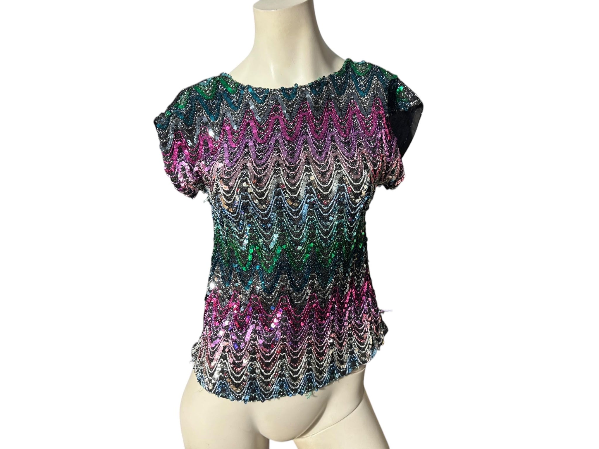 Vintage sequin top, tag says Joanna sz S, 40% acetate, 15% lurex, 30% polyester, 15% rayon. Shirt is rainbow sequins, has silver and black glitter back. Top is in great condition, measurements are