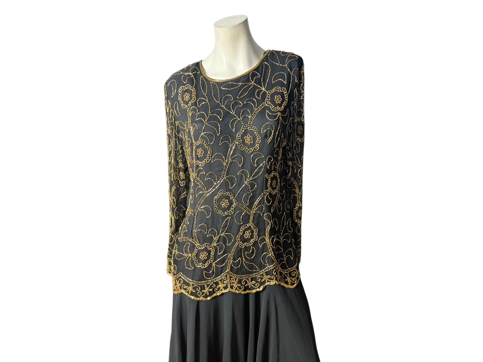 Vintage 80's black & gold dress, sz L, 100% silk. Dress has black and gold beading, zips up the back, has flowing skirt. Dress has shoulder pads, in good vintage condition. Measurements are