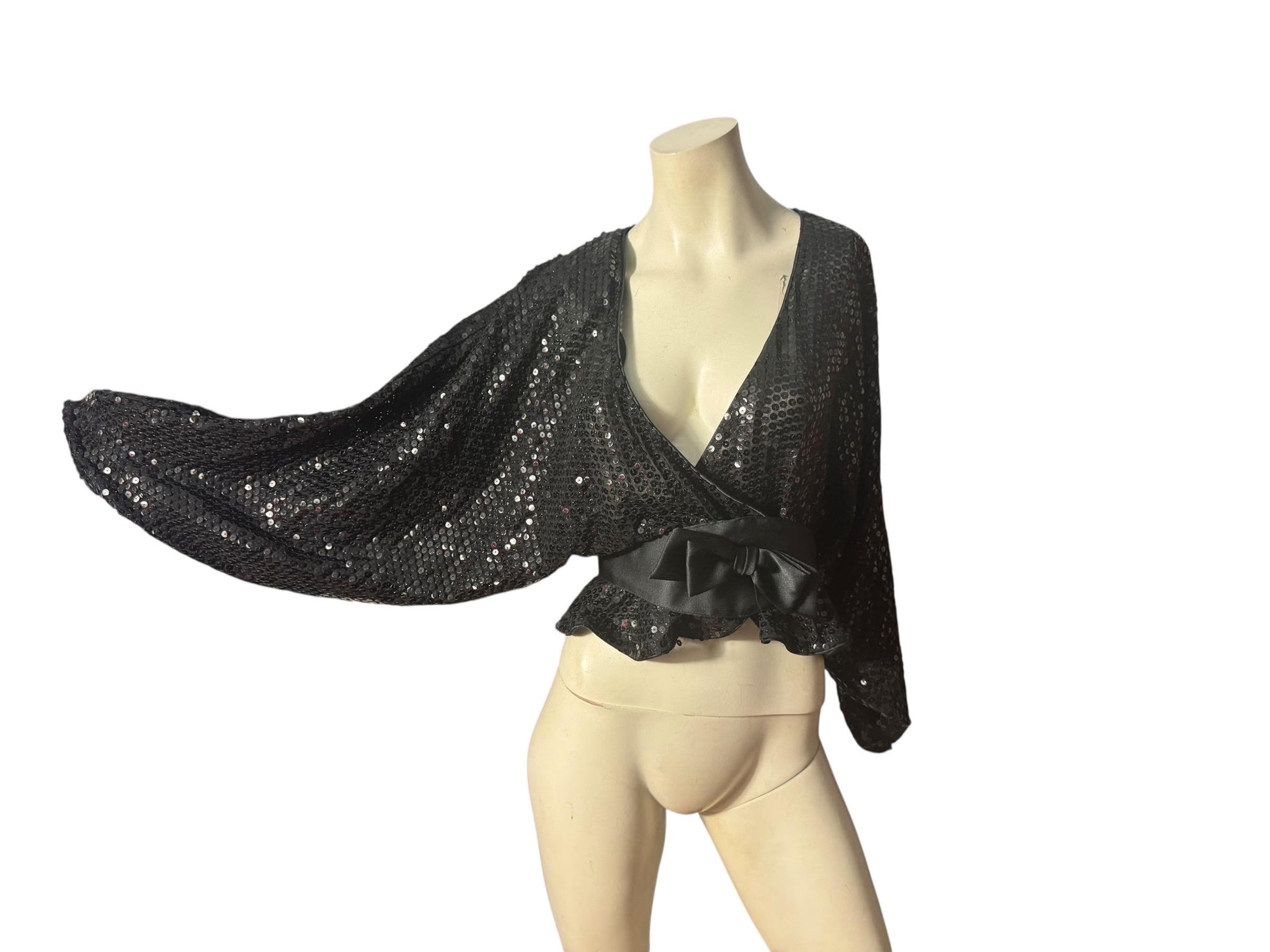 Vintage black sequin wrap top, tag says sz 8 or 9. Top is fully lined, sequins, shoulder pads, clasps.with a belt that has a bow, top is in great condition. Measurements are