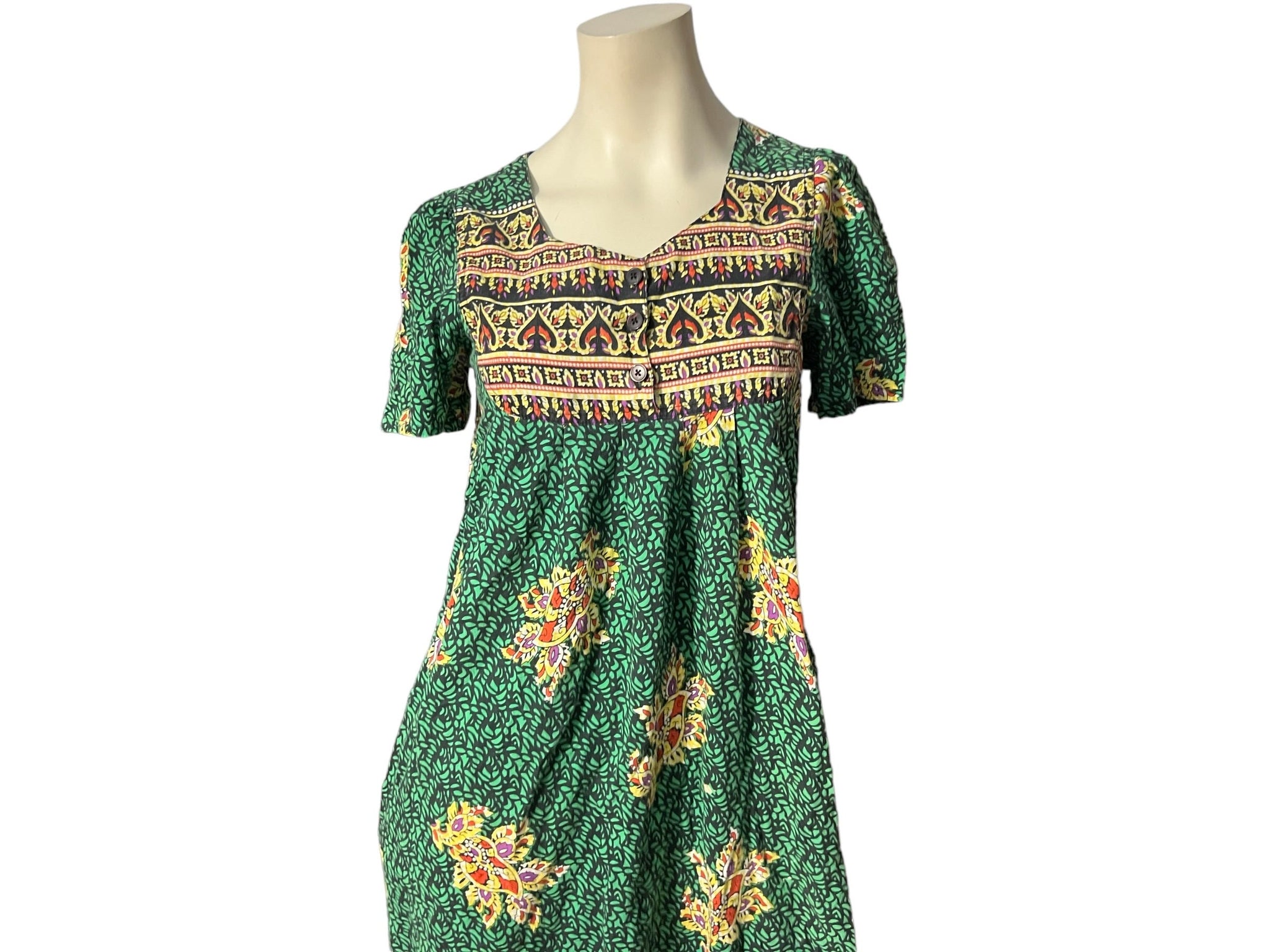 Vintage 80's lounge dress, tag says Loungees, sz S, 100% cotton. Dress has pockets, India print, 3 buttons at the bust. Dress is soft and in good vintage condition, measurements are