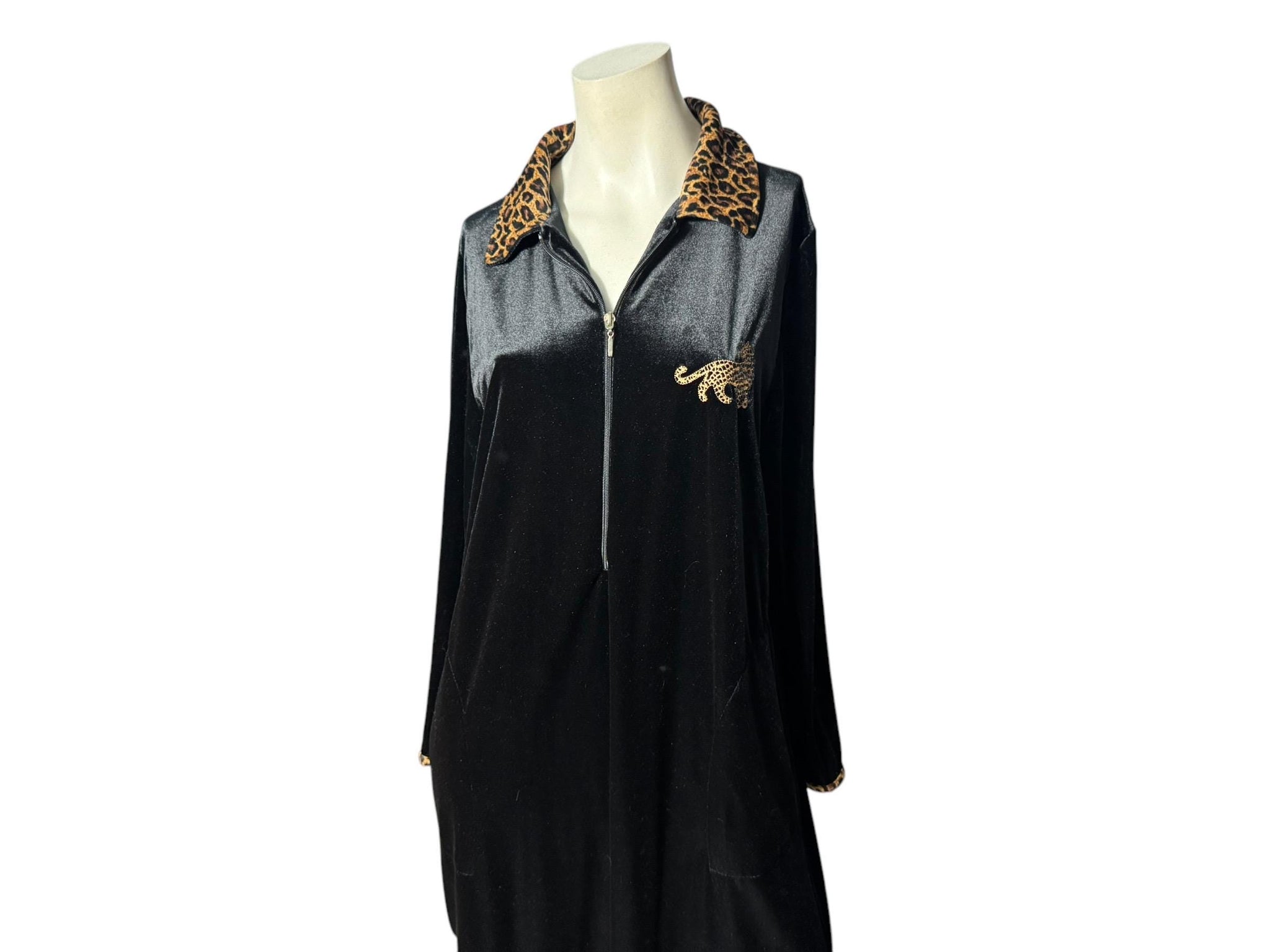 Vintage black & leopard velour lounge robe, tag says Amanda Stewart, sz M, 93% polyester, 7% spandex, zip up the front, has leopard collar and sleeve trim- with small leopard on top front, has pockets, is in great vintage condition, measurements are