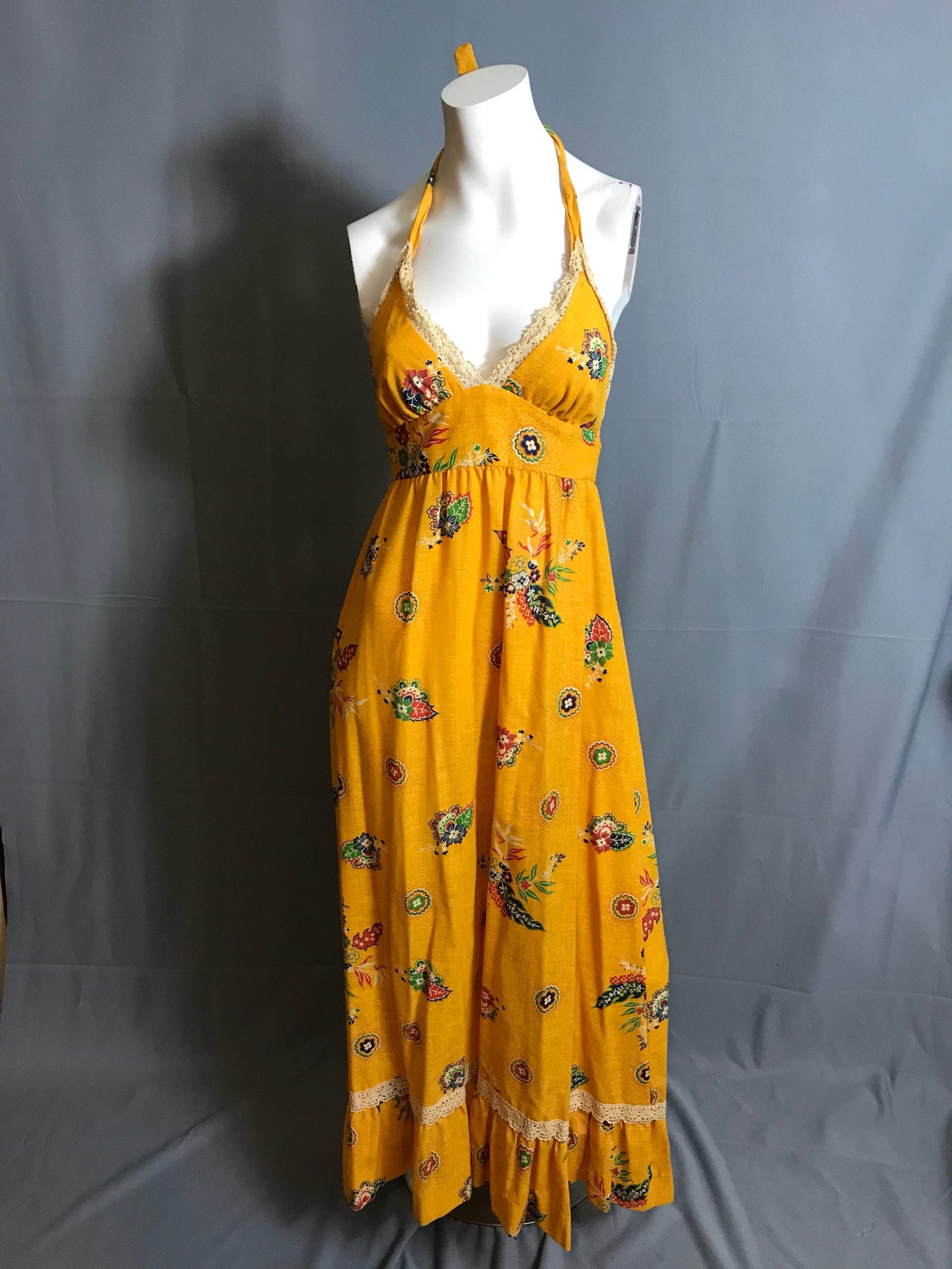 Vintage 60’s boho halter dress, tag says Daffy California, sz M, 65% polyester 35% cotton. Dress is a yellow orange color, has flowers all over, ruffle around the bottom, trimmed in lace. Dress zips up the back, and is in great condition. Measurements are